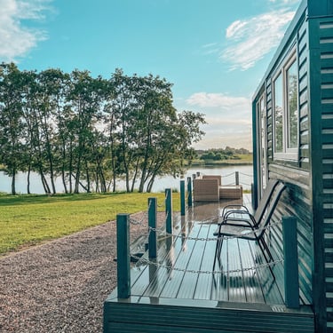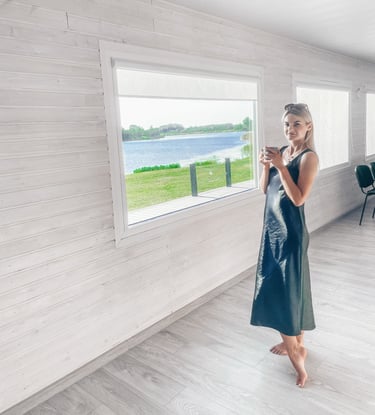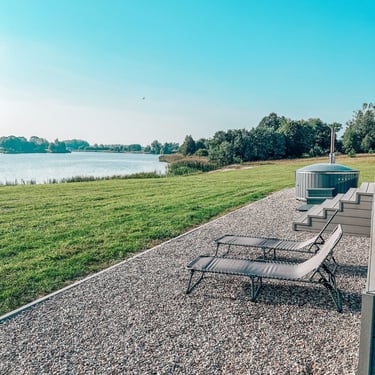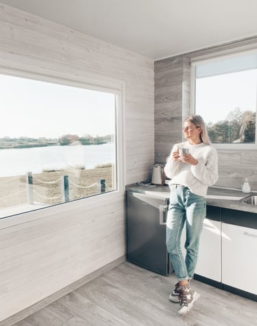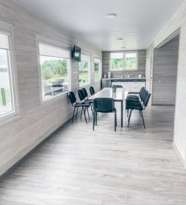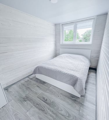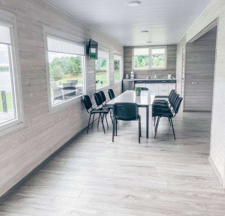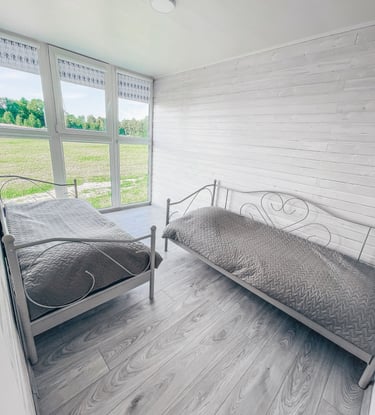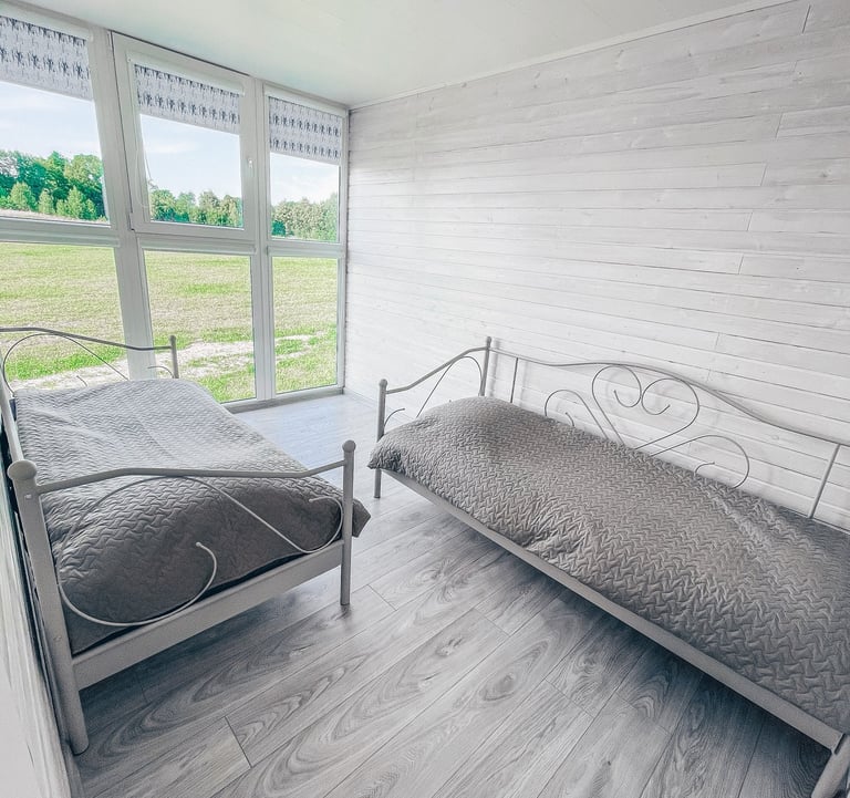 Balto vėjo namai tai puiki vieta ramiam poilsiui gamtoje ant tvenkinio kranto su visais apgyvendinimo patogumais. Šešiaviečiame namelyje rasite du atskirus miegamuosius su patalyne, didžiulę svetainę, įrengtą mini virtuvę su kavos aparatu, šaldytuvu, kaitlente ir visais reikiamais indais, vonios kambarį su dušo kabina. Namelyje yra vėsinimo ir šildymo sistema, todėl čia apsistoti komfortiška visus metus.